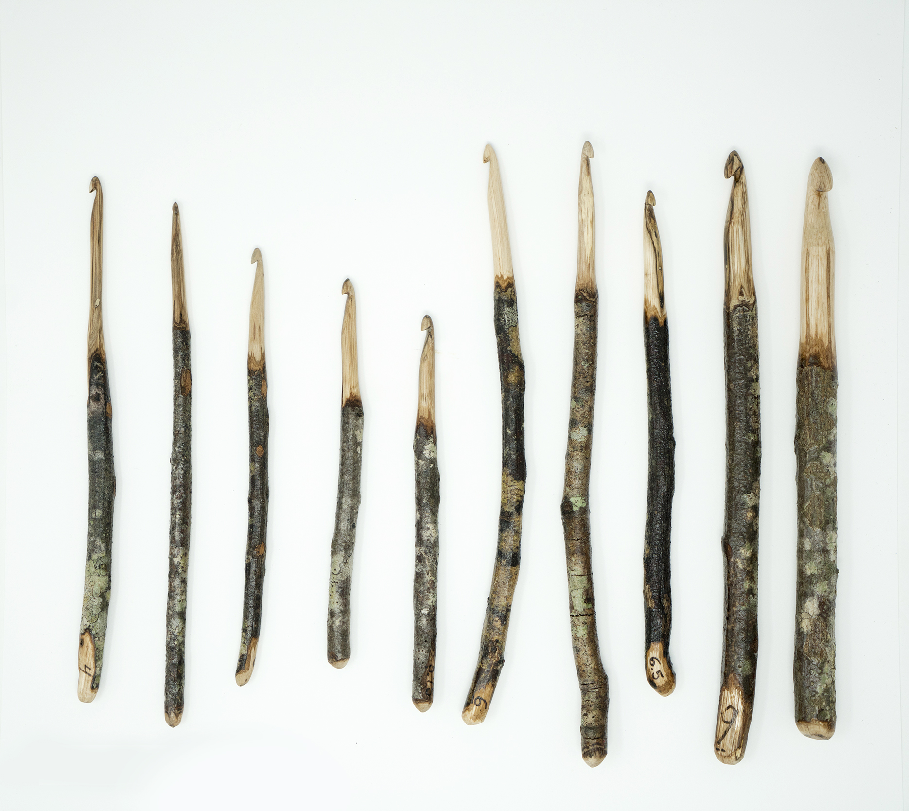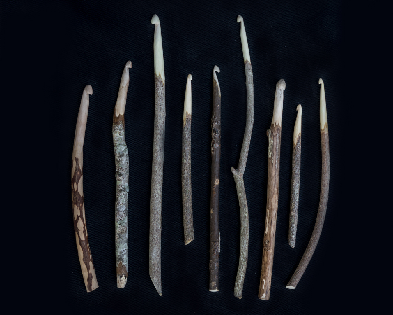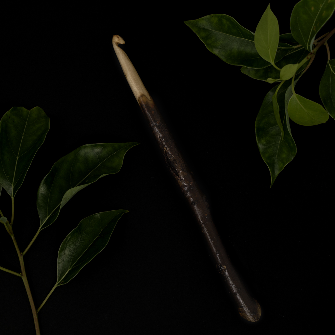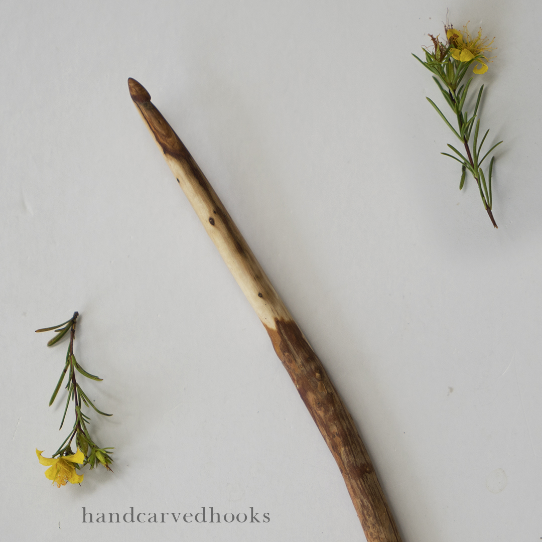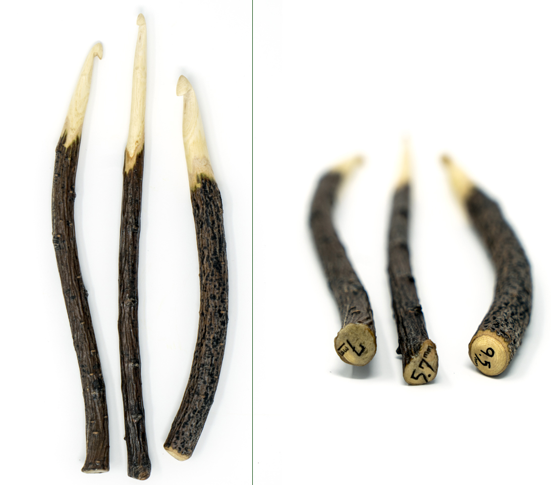Barky Handle rustic crochet hooks are beautiful statement pieces. They have most of their bark intact, with the head and neck carved and sanded into a perfectly smooth hook. They can be left raw (unsealed) and will naturally seal over time as handled with human hands and with the lanolin oil from working with wool. The hooks can also be sealed. I offer a natural beeswax blend seal or an heirloom quality polyurethane seal, which will provide a lifetime zero-maintenance seal for the hooks. If you are looking for hooks that have been sanded perfectly smooth, you want the Refined Rustic Crochet Hooks.